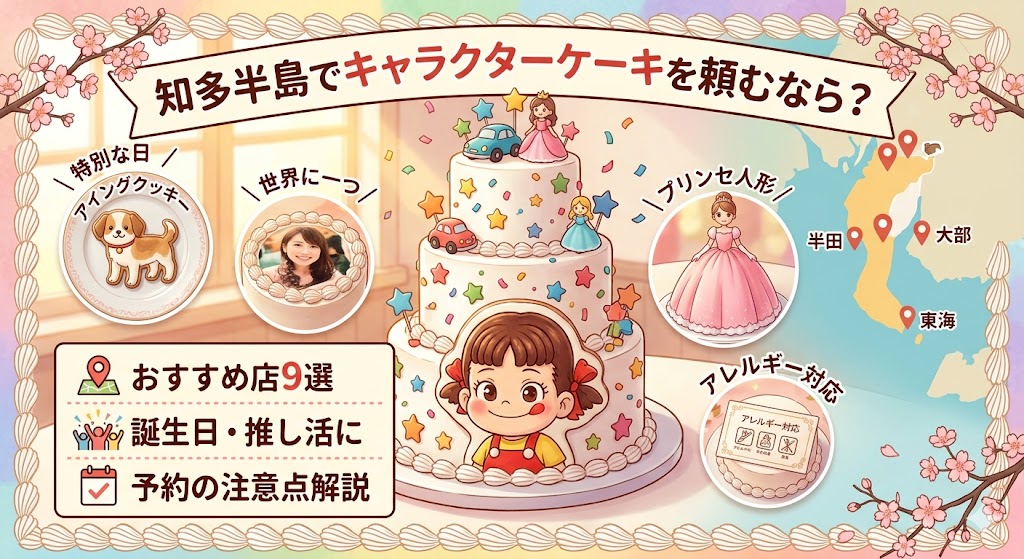 愛知県の知多半島エリア(半田市・大府市・東海市・知多市など)には、職人の技が光るクオリティの高いキャラクターケーキや、細かな要望に応えてくれるオーダーケーキのお店が数多くあります 。