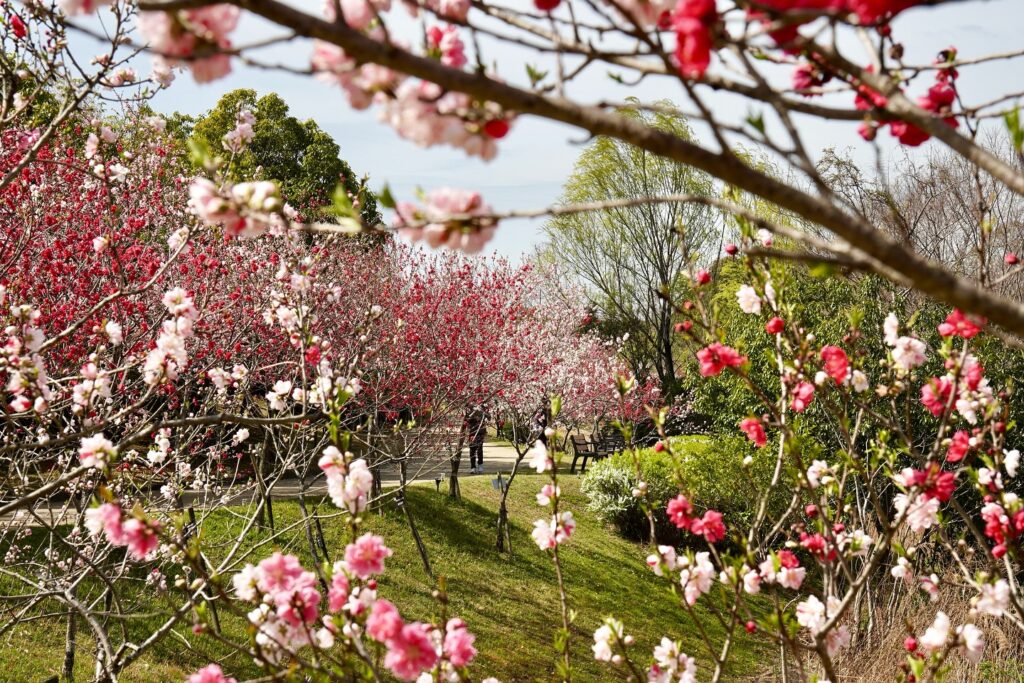 約51.5ヘクタールという広大な敷地を持つあいち健康の森公園は、多種多様な植物が楽しめるスポットです。周辺を含めて約1,200本も植えられている「ハナモモ」が最大の見どころで、3月下旬には濃いピンク・赤・白のハナモモとソメイヨシノやヤエザクラが共演し、華やかな色彩に包まれます。