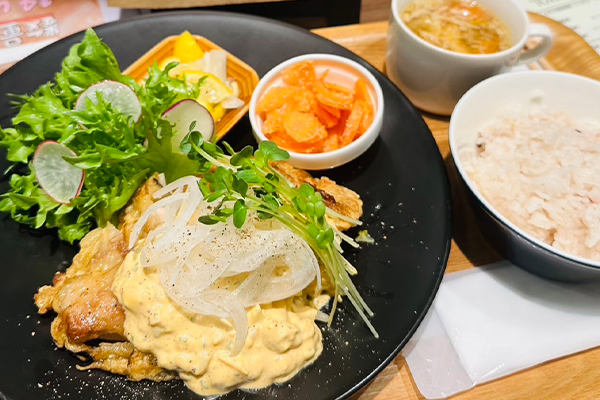 管理栄養士が監修したワンプレートランチや、体調に合わせて選べるスムージーなど、美味しくて体にも優しいメニューが揃っています。駅直結なので、散策の締めくくりにも最適です。