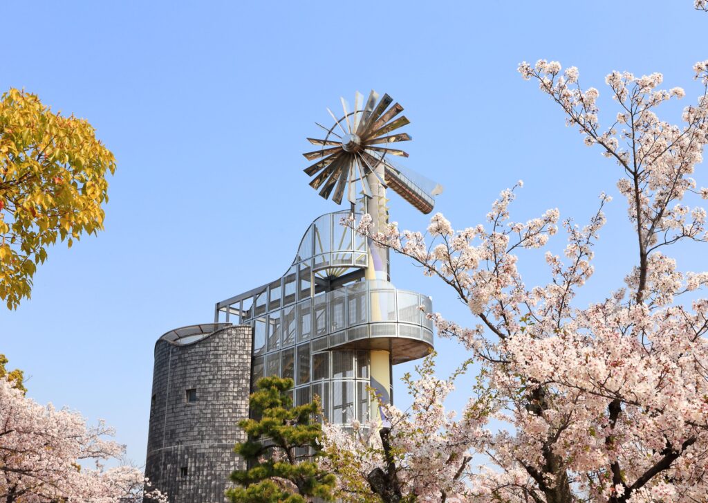 園内には風車が設置されており、桜とのコラボレーションは桃山公園ならではの風景です。シーズン中は夜間のライトアップも実施されます。