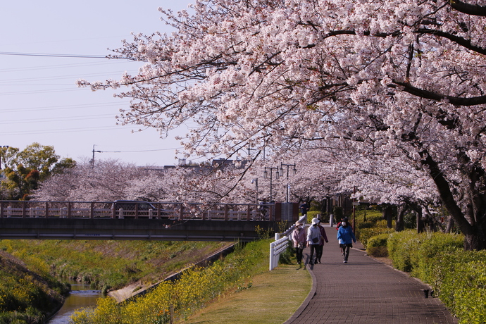 大府市を流れる石ヶ瀬川と鞍流瀬川の堤防沿いには、美しい桜並木が続く緑道が整備されています。石ヶ瀬川緑道では春の花々を眺めながら、鞍流瀬川緑道では水辺の景色を楽しみながら、心地よいウォーキングやジョギングが楽しめます。特に石ヶ瀬川沿いは「桜ハナモモ花めぐり」のコースにもなっており、桜とハナモモのパステルカラーが続く散策路は圧巻です。