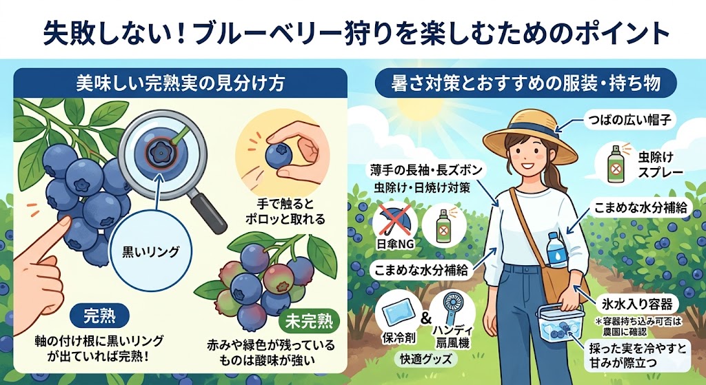 ブルーベリー狩りは真夏の炎天下で行うことが多いため、万全の対策が必要です。服装はネットや苗に当たるため日傘はNGで、つばの広い帽子を着用し、虫除けや日焼け対策として薄手の長袖・長ズボンが推奨されます。