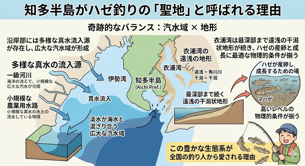 特に東側の衣浦湾は、最深部まで遠浅の干潟状の地形が続いており、ハゼが産卵し成長するための物理的な条件が非常に高いレベルで揃っています。この豊かな生態系こそが、知多半島が全国の釣り人から愛される理由なのです。