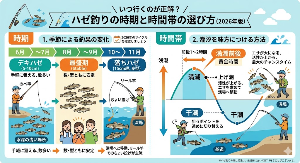 ハゼ釣りには、爆釣が期待できる「旬」と「時間帯」があります。2026年のサイクルを確認しましょう。
